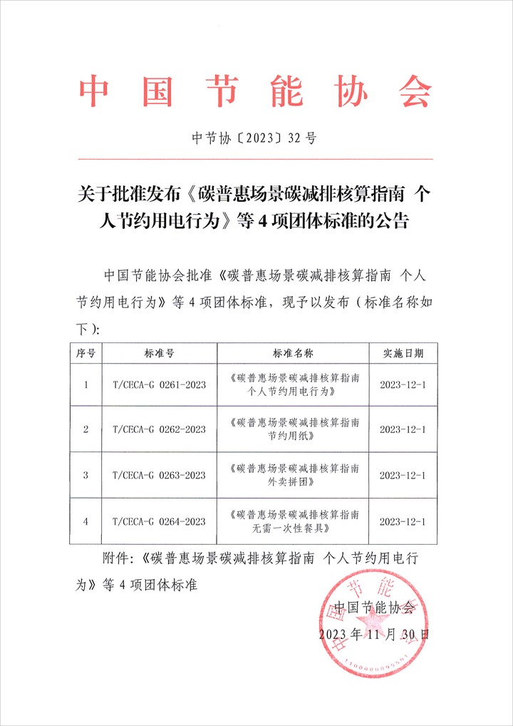 關(guān)于批準(zhǔn)發(fā)布《碳普惠場景碳減排核算指南個(gè)人節(jié)約用電行為》等4項(xiàng)團(tuán)體標(biāo)準(zhǔn)的公告.PDF
