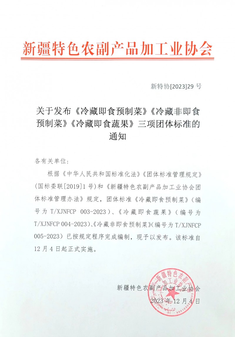 根據《中華人民共和國標準化法》《團體標準管理規定》(國標委聯[2019]1號)和《新疆特色農副產品加工業協會團體標準管理辦法》規定,團體標準《冷藏即食預制菜》(編號為T/XJNFCP 003-2023)、《冷藏即食蔬果》(編號為T/XJNFCP 004-2023)、《冷藏非即食預制菜》(編號為T/XJNFCP 005-2023)已按規定程序完成編制,現予以發布。該標準自12月4日起正式實施。