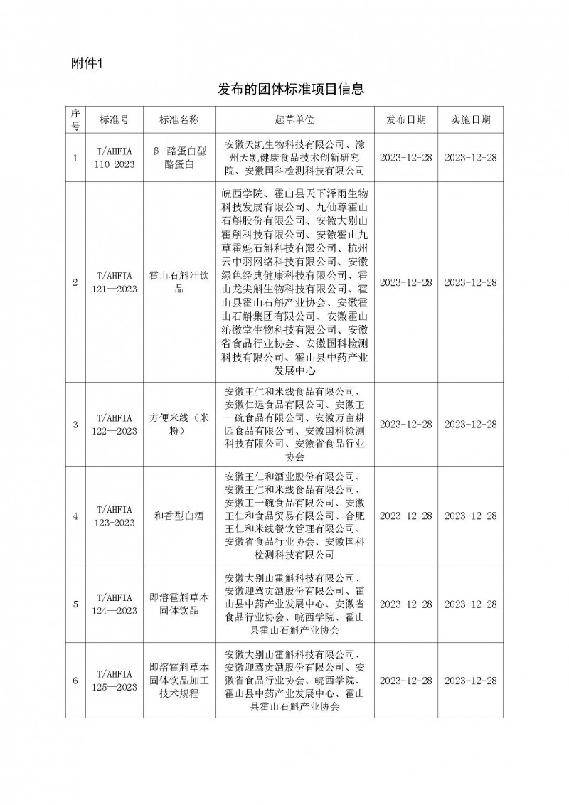 T/AHFIA 110-2023 β-酪蛋白型酪蛋白 T/AHFIA 121-2023 霍山石斛汁飲品 T/AHFIA 122-2023 方便米線(米粉) T/AHFIA 123-2023 和香型白酒 T/AHFIA 124-2023 即溶霍斛草本固體飲品 T/AHFIA 125-2023 即溶霍斛草本固體飲品加工技術規程