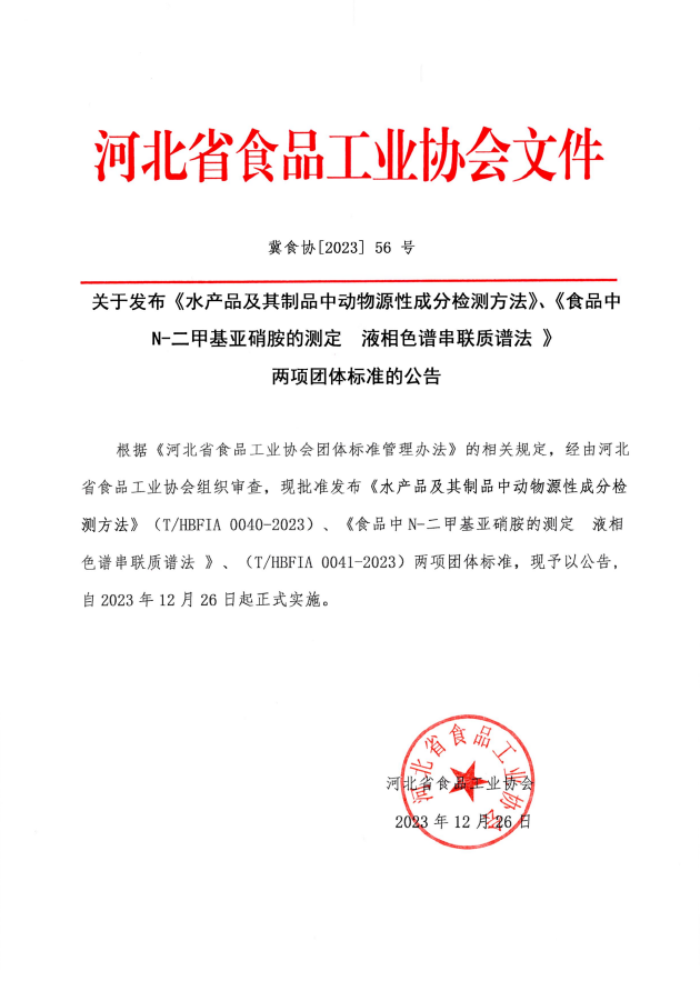 以上為河北省食品工業(yè)協(xié)會關(guān)于發(fā)布《水產(chǎn)品及其制品中動物源性成分檢測方法》、《食品中N-二甲基亞硝胺的測定 液相色譜串聯(lián)質(zhì)譜法》兩項團體標(biāo)準(zhǔn)的公告(冀食協(xié)[2023]56號)的檢測服務(wù)介紹,如有其他疑問可聯(lián)系在線工程師!