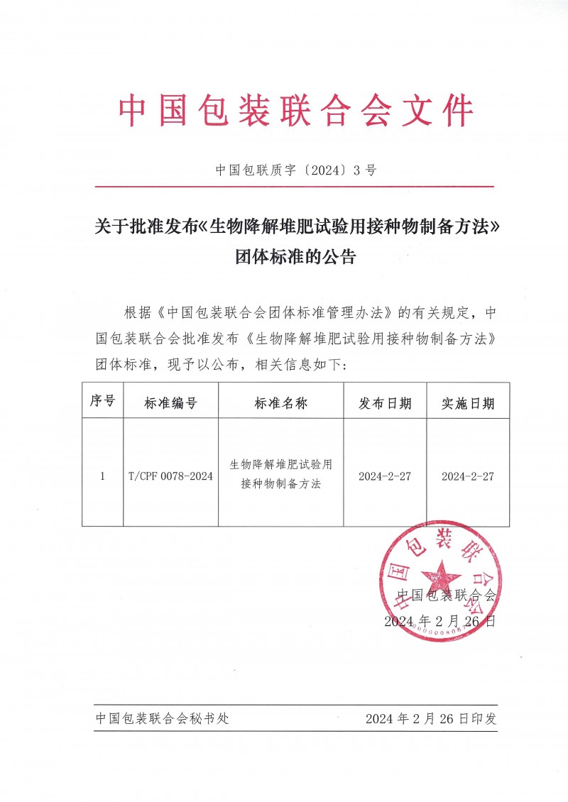 以上為中國(guó)包裝聯(lián)合會(huì)關(guān)于批準(zhǔn)發(fā)布《生物降解堆肥試驗(yàn)用接種物制備方法》團(tuán)體標(biāo)準(zhǔn)的公告(中國(guó)包聯(lián)質(zhì)字[2024]3號(hào))的檢測(cè)服務(wù)介紹,如有其他疑問可聯(lián)系在線工程師!