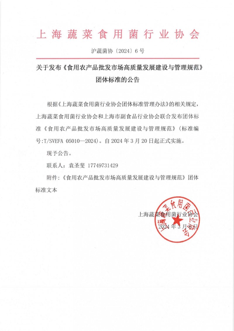 根據(jù)《上海蔬菜食用菌行業(yè)協(xié)會(huì)團(tuán)體標(biāo)準(zhǔn)管理辦法》的相關(guān)規(guī)定,上海蔬菜食用菌行業(yè)協(xié)會(huì)和上海市副食品行業(yè)協(xié)會(huì)聯(lián)合發(fā)布團(tuán)體標(biāo)準(zhǔn)《食用農(nóng)產(chǎn)品批發(fā)市場(chǎng)高質(zhì)量發(fā)展建設(shè)與管理規(guī)范》(標(biāo)準(zhǔn)編號(hào):T/SVEFA 05010—2024)。自2024年3月20日起正式實(shí)施。