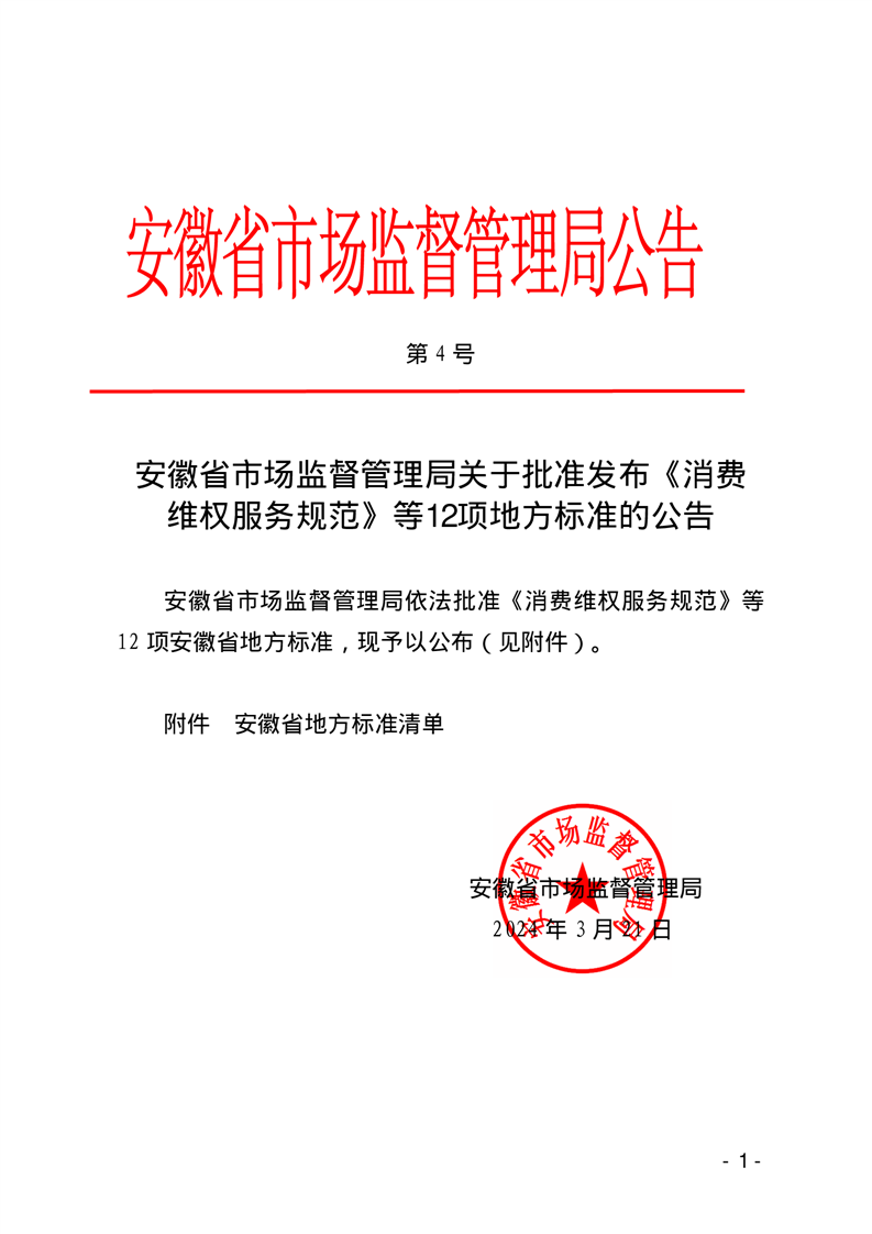 安徽省市場(chǎng)監(jiān)督管理局關(guān)于批準(zhǔn)發(fā)布《消費(fèi)維權(quán)服務(wù)規(guī)范》等12項(xiàng)地方標(biāo)準(zhǔn)的公告