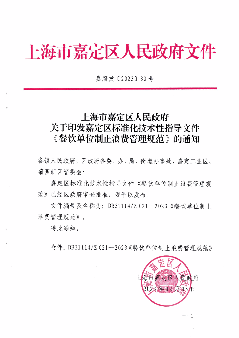 嘉定區標準化技術性指導文件《餐飲單位制止浪費管理規范》已經區政府審查批準,現予以發布。