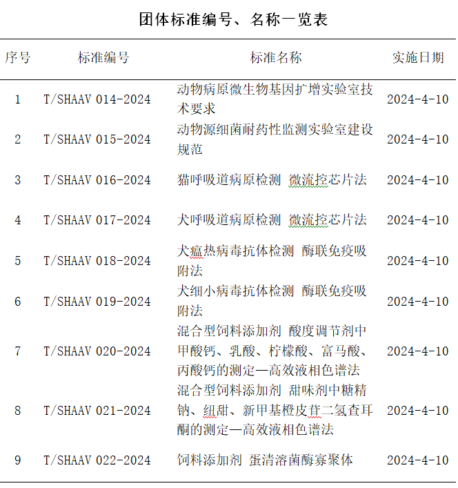 根據《上海市畜牧獸醫學會團體標準管理辦法》(滬牧醫學[2022]第17號)規定,上海市畜牧獸醫學會現批準發布《動物病原微生物基因擴增實驗室技術要求》、《動物源細菌耐藥性監測實驗室建設規范》、《貓呼吸道病原檢測 微流控芯片法》、《犬呼吸道病原檢測 微流控芯片法》、《犬瘟熱病毒抗體檢測 酶聯免疫吸附法》、《犬細小病毒抗體檢測 酶聯免疫吸附法》、《混合型飼料添加劑 酸度調節劑中甲酸鈣、乳酸、檸檬酸、富馬酸、丙酸鈣的測定—高效液相色譜法》、《混合型飼料添加劑 甜味劑中糖精鈉、紐甜、新甲基橙皮苷二氫查耳酮的測定—高效液相色譜法》、《飼料添加劑 蛋清溶菌酶寡聚體》九項團體標準。標準于2024年4月10日發布,自2024年4月10日起實施。現予以公告。