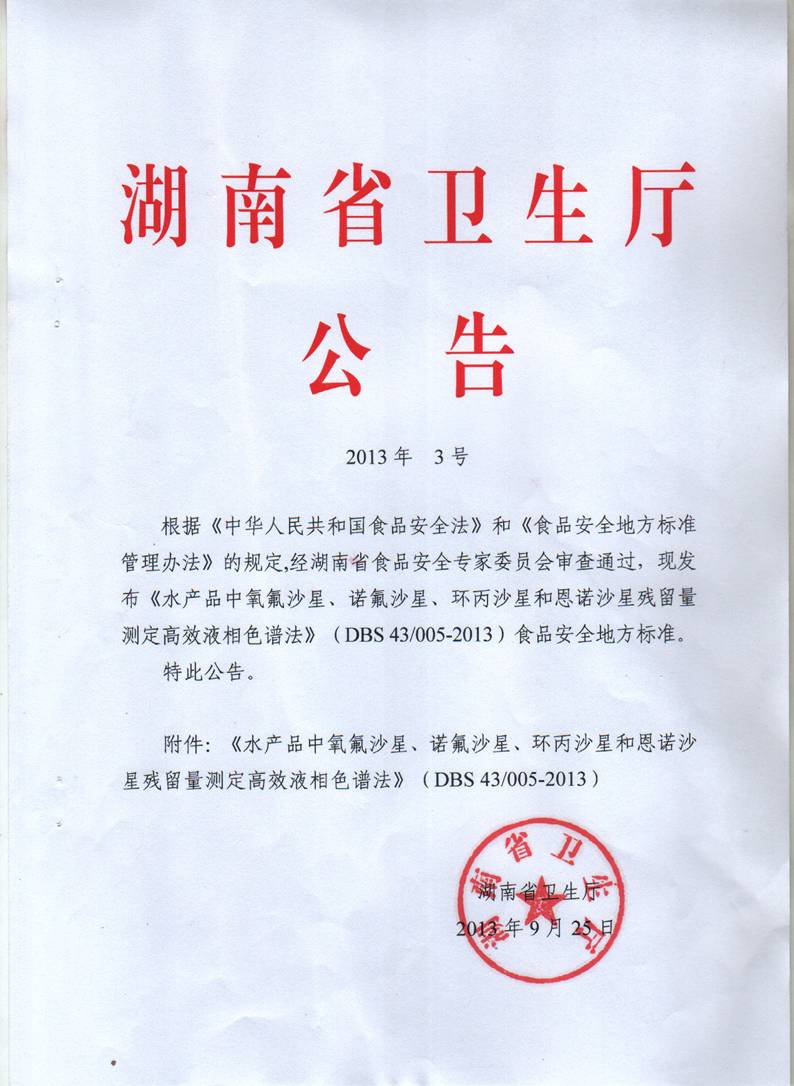 根據(jù)《中華人民共和國食品安全法》和《食品安全地方標準管理辦法》的規(guī)定,經(jīng)湖南省食品安全專家委員會審查通過,現(xiàn)發(fā)布《水產(chǎn)品中氧氟沙星、諾氟沙星、環(huán)丙沙星和恩諾沙星殘留量測定高效液相色譜法》(DBS 43/005-2013)食品安全地方標準。