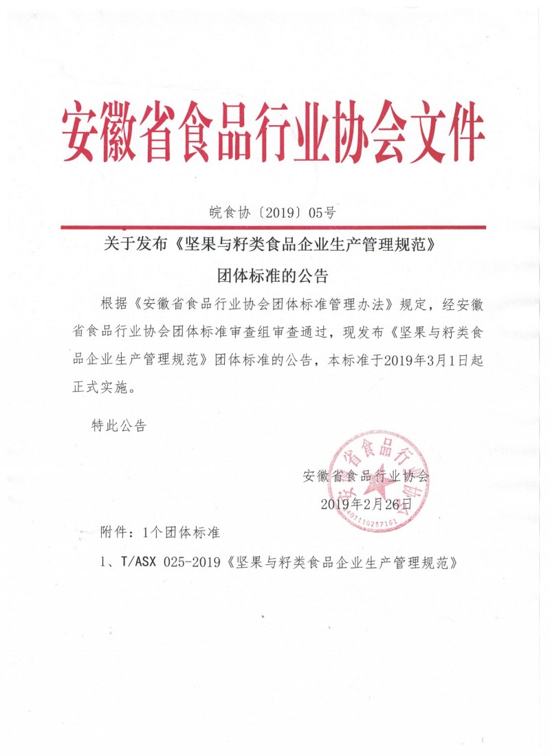 以上為安徽省食品行業協會關于發布《堅果與籽類食品企業生產管理規范》 團體標準的公告( 皖食協〔2019 〕05號)的檢測服務介紹,如有其他疑問可聯系在線工程師!