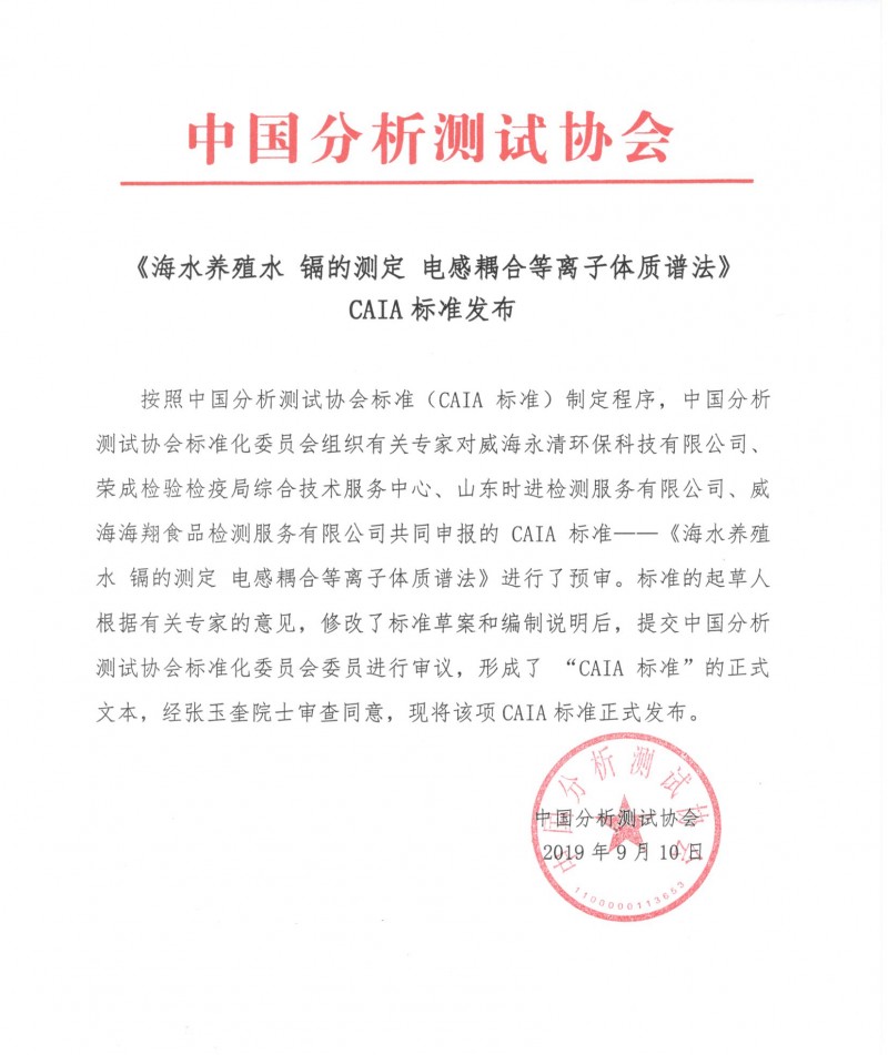 以上為中國分析測試協會關于《海水養殖水 鎘的測定 電感耦合等離子體質譜法》CAIA標準的發布的檢測服務介紹,如有其他疑問可聯系在線工程師!
