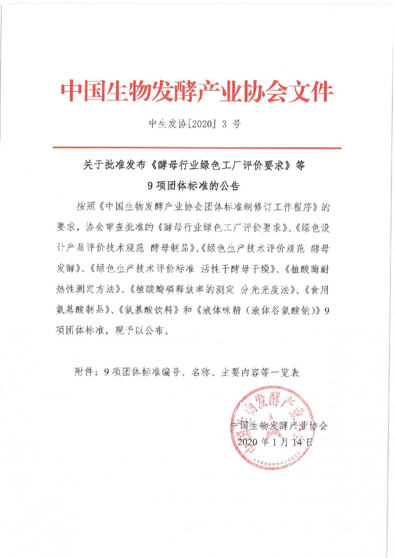 | 1 | T/CBFIA 01001-2020 | 酵母行業綠色工廠評價要求 | 2020-02-01 |