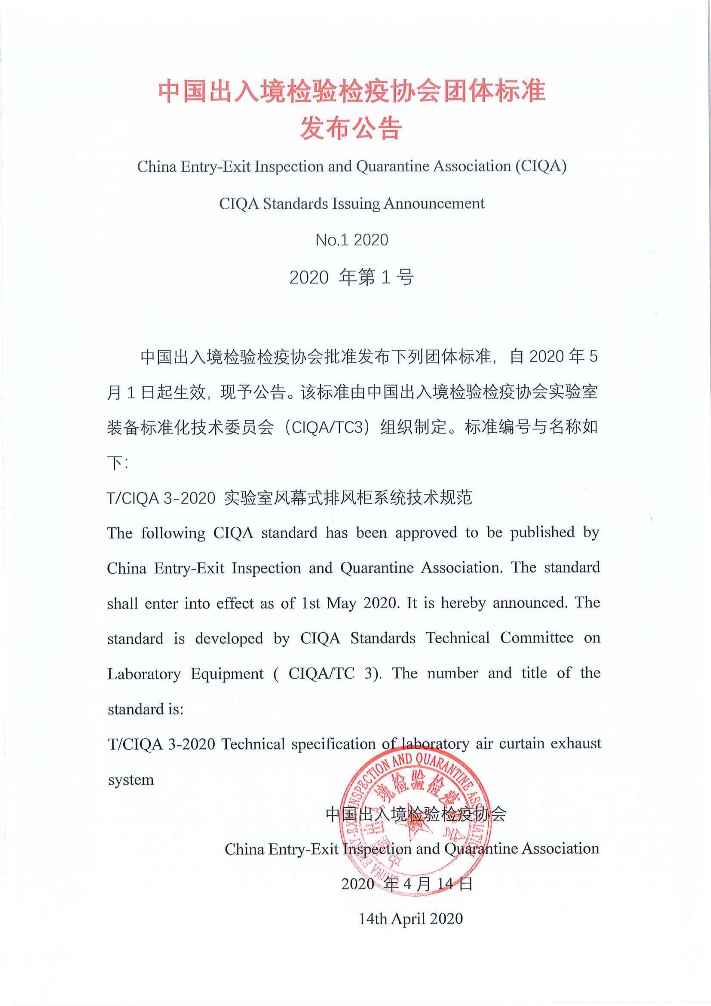 以上為中國出入境檢驗檢疫協會團體標準發布公告《實驗室風幕式排風柜系統技術規范》(2020年第1號)的檢測服務介紹,如有其他疑問可聯系在線工程師!