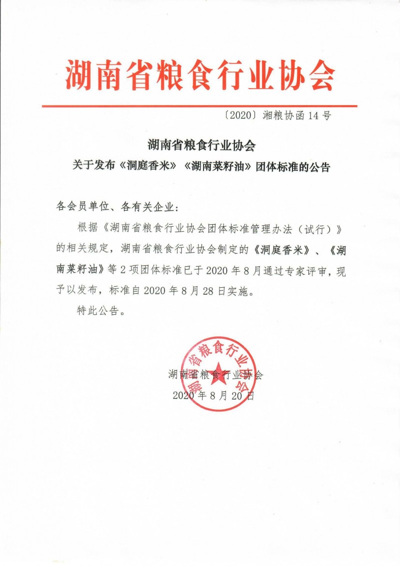 | 1 | T/HNAGS 14-2020 | 湖南菜籽油 | 2020-08-18 | 2020-08-28 |