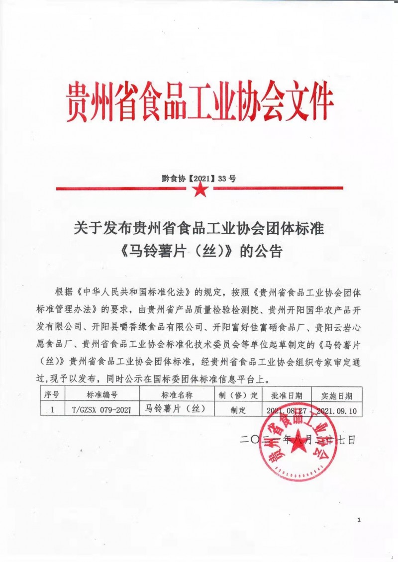 根據《中華人民共和國標準化法》的規定,按照《貴州省食品工業協會團體標準管理辦法》的要求,由貴州省產品質量檢驗檢測院、貴州開陽國華農產品開發有限公司、開陽縣嚼香緣食品有限公司、開陽富好佳富硒食品廠、貴陽云巖心愿食品廠、貴州省食品工業協會標準化技術委員會等單位起草制定的《馬鈴薯片(絲)》貴州省食品工業協會團體標準,經貴州省食品工業協會組織專家審定通過,現予以發布,同時公示在國標委團體標準信息平臺上。