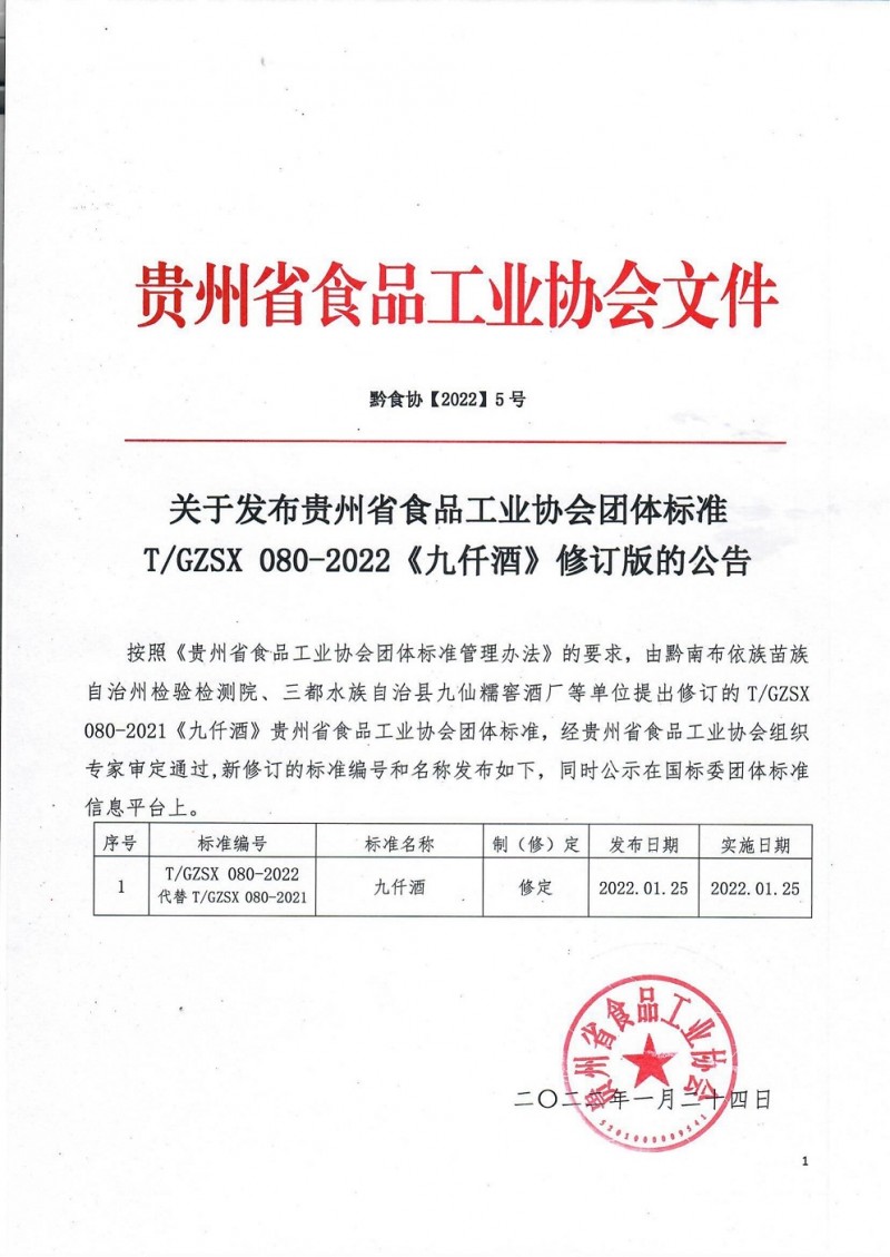 按照《貴州省食品工業(yè)協(xié)會(huì)團(tuán)體標(biāo)準(zhǔn)管理辦法》的要求,由黔南布依族苗族自治州檢驗(yàn)檢測(cè)院、三都水族自治縣九仙糯窖酒廠等單位提出修訂的T/GZSX 080-2021《九仟酒》貴州省食品工業(yè)協(xié)會(huì)團(tuán)體標(biāo)準(zhǔn),經(jīng)貴州省食品工業(yè)協(xié)會(huì)組織專家審定通過,新修訂的標(biāo)準(zhǔn)編號(hào)和名稱發(fā)布如下,同時(shí)公示在國(guó)標(biāo)委團(tuán)體標(biāo)準(zhǔn)信息平臺(tái)上。
