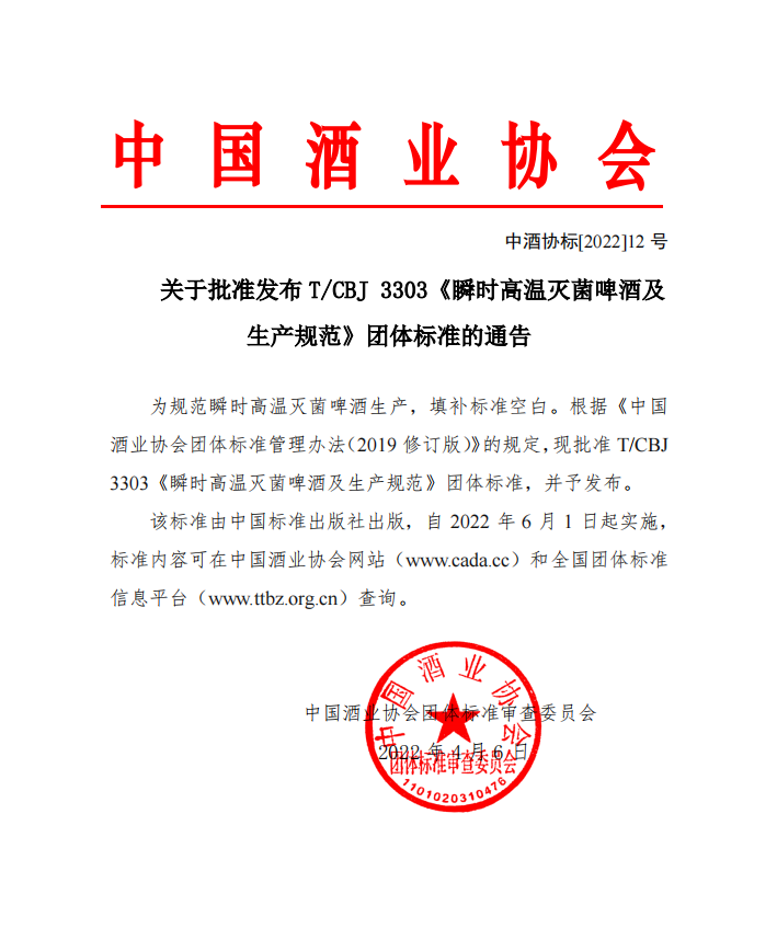 為規范瞬時高溫滅菌啤酒生產,填補標準空白。根據《中國酒業協會團體標準管理辦法(2019修訂版)》的規定,現批準T/CBJ 3303《瞬時高溫滅菌啤酒及生產規范》團體標準,并予發布。