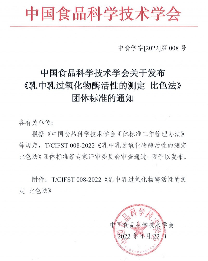 以上為中國(guó)食品科學(xué)技術(shù)學(xué)會(huì)關(guān)于發(fā)布《乳中乳過(guò)氧化物酶活性的測(cè)定 比色法》團(tuán)體標(biāo)準(zhǔn)的通知(中食學(xué)字[2022]第008號(hào))的檢測(cè)服務(wù)介紹,如有其他疑問(wèn)可聯(lián)系在線工程師!
