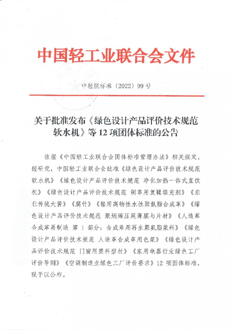 以上為中國輕工業(yè)聯(lián)合會關(guān)于批準發(fā)布《綠色設(shè)計產(chǎn)品評價技術(shù)規(guī)范 軟水機》等12項團體標準的公告(中輕聯(lián)標準[2022]99號)的檢測服務(wù)介紹,如有其他疑問可聯(lián)系在線工程師!
