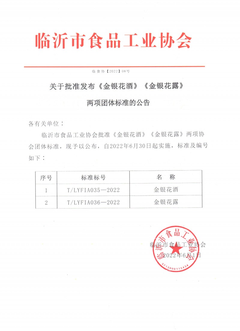 為有效推動沂蒙山金銀花酒、金銀花露產(chǎn)業(yè)標(biāo)準(zhǔn)化體系建設(shè)和完善,進(jìn)一步提升“金銀花酒、金銀花露”的品牌影響力,助力金銀花產(chǎn)業(yè)高質(zhì)量發(fā)展。6月1日,由臨沂市食品工業(yè)協(xié)會提出并歸口,由平邑縣輝瑞中藥材有限公司、臨沂市食品工業(yè)協(xié)會、瑞青中藥材有限公司、午時食品有限公司、民興中藥材有限公司等標(biāo)準(zhǔn)單位負(fù)責(zé)起草,臨沂市市場監(jiān)督管理局、臨沂市農(nóng)業(yè)科學(xué)院、山東省中藥材行業(yè)協(xié)會、臨沂市科技職業(yè)學(xué)院、平邑縣市場監(jiān)督管理局、費縣市場監(jiān)督管理局、平邑縣農(nóng)業(yè)農(nóng)村發(fā)展服務(wù)中心等單位共同參與審定的《金銀花酒》、《金銀花露》團體標(biāo)準(zhǔn)通過審查,在全國團體標(biāo)準(zhǔn)信息平臺上予以正式發(fā)布,并于2022年6月30日起實施。