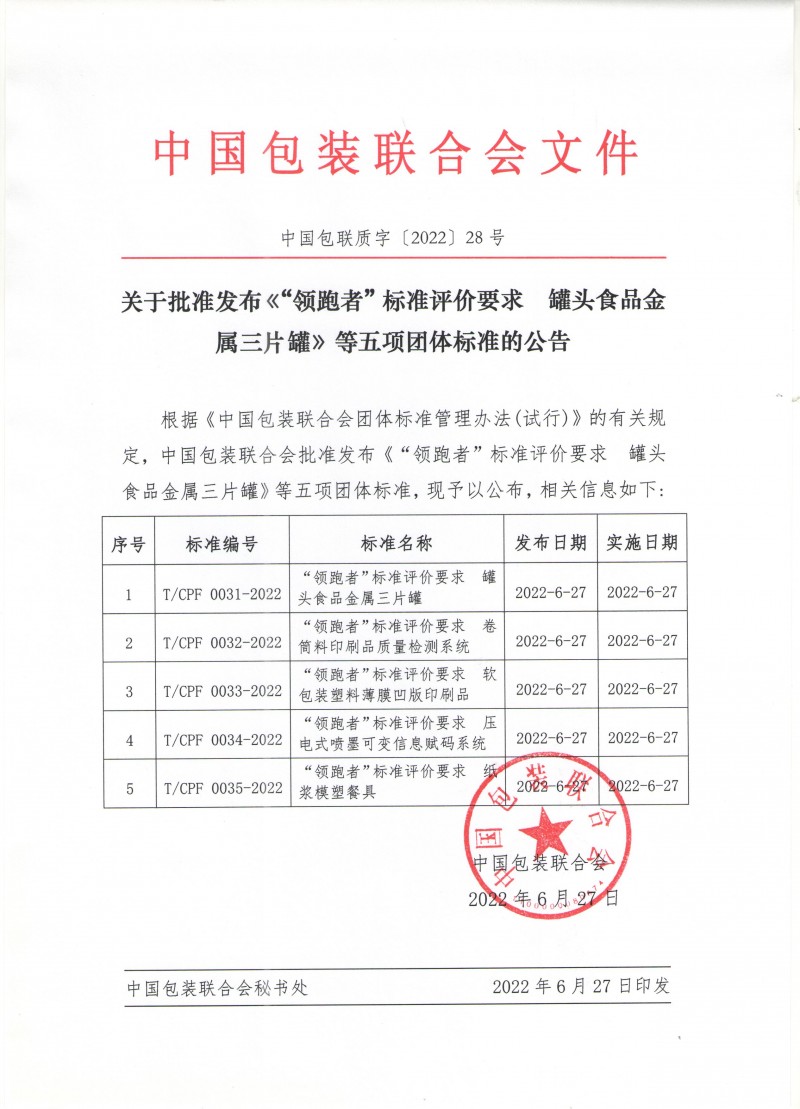 T/CPF 0031-2022 “領(lǐng)跑者”標(biāo)準(zhǔn)評(píng)價(jià)要求 罐頭食品金屬三片罐 T/CPF 0035-2022 “領(lǐng)跑者”標(biāo)準(zhǔn)評(píng)價(jià)要求 紙漿模塑餐具