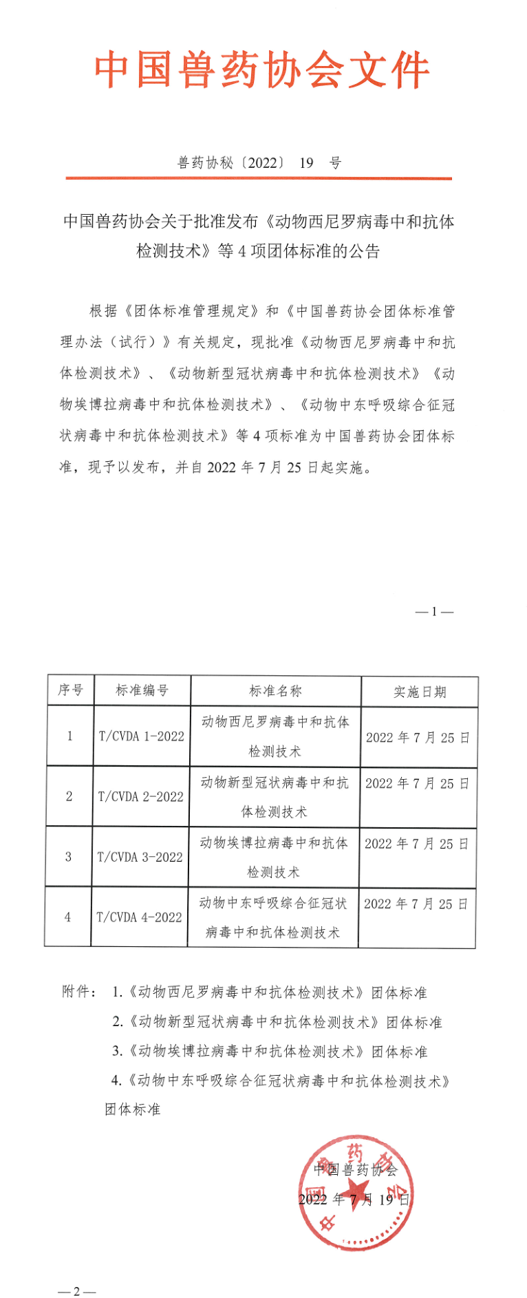 T/CVDA 1-2022 動(dòng)物西尼羅病毒中和抗體檢測(cè)技術(shù) T/CVDA 2-2022 動(dòng)物新型冠狀病毒中和抗體檢測(cè)技術(shù) T/CVDA 3-2022 動(dòng)物埃博拉病毒中和抗體檢測(cè)技術(shù) T/CVDA 4-2022 動(dòng)物中東呼吸綜合征冠狀病毒中和抗體檢測(cè)技術(shù)