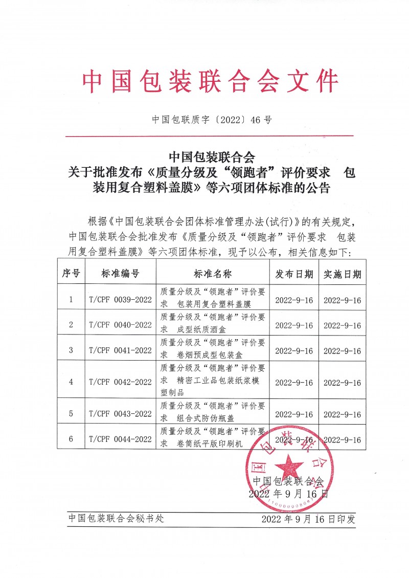 | 1 | T/CPF 0039-2022 | 質量分級及“領跑者”評價要求 包裝用復合塑料蓋膜 | 2022-09-16 | 2022-09-16 |