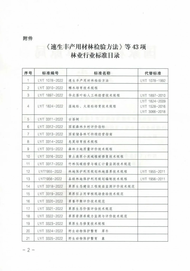 國家林業和草原局批準發布《速生豐產用材林檢驗方法》等43項林業行業標準(見附件),自2023年4月1日起實施。特此公告。