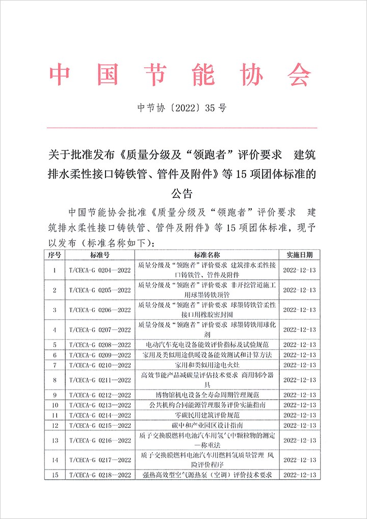 以上為中國節(jié)能協(xié)會關(guān)于批準(zhǔn)發(fā)布《質(zhì)量分級及“領(lǐng)跑者”評價(jià)要求 建筑排水柔性接口鑄鐵管、管件及附件》等15項(xiàng)團(tuán)體標(biāo)準(zhǔn)的公告(中節(jié)協(xié)[2022]35號)的檢測服務(wù)介紹,如有其他疑問可聯(lián)系在線工程師!
