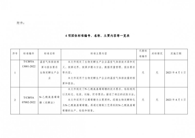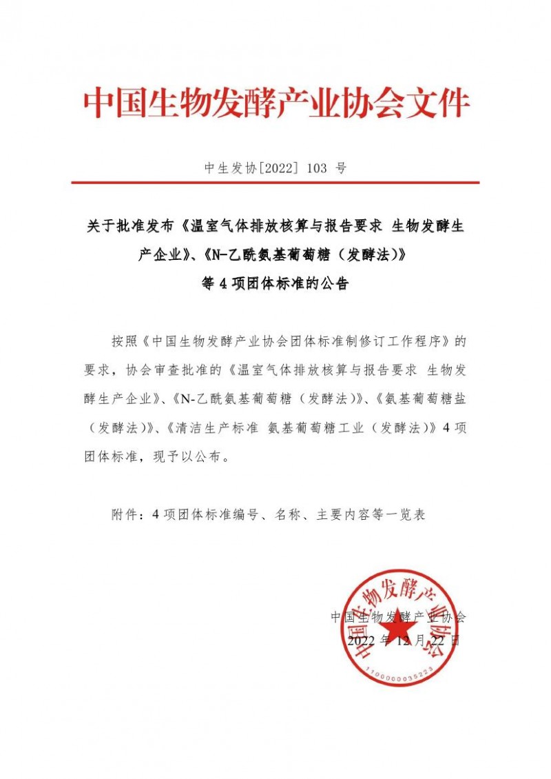 中國生物發(fā)酵產業(yè)協會關于批準發(fā)布《溫室氣體排放核算與報告要求 生物發(fā)酵生產企業(yè)》、《N-乙酰氨基葡萄糖(發(fā)酵法)》等4項團體標準的公告(中生發(fā)協[2022]103號)