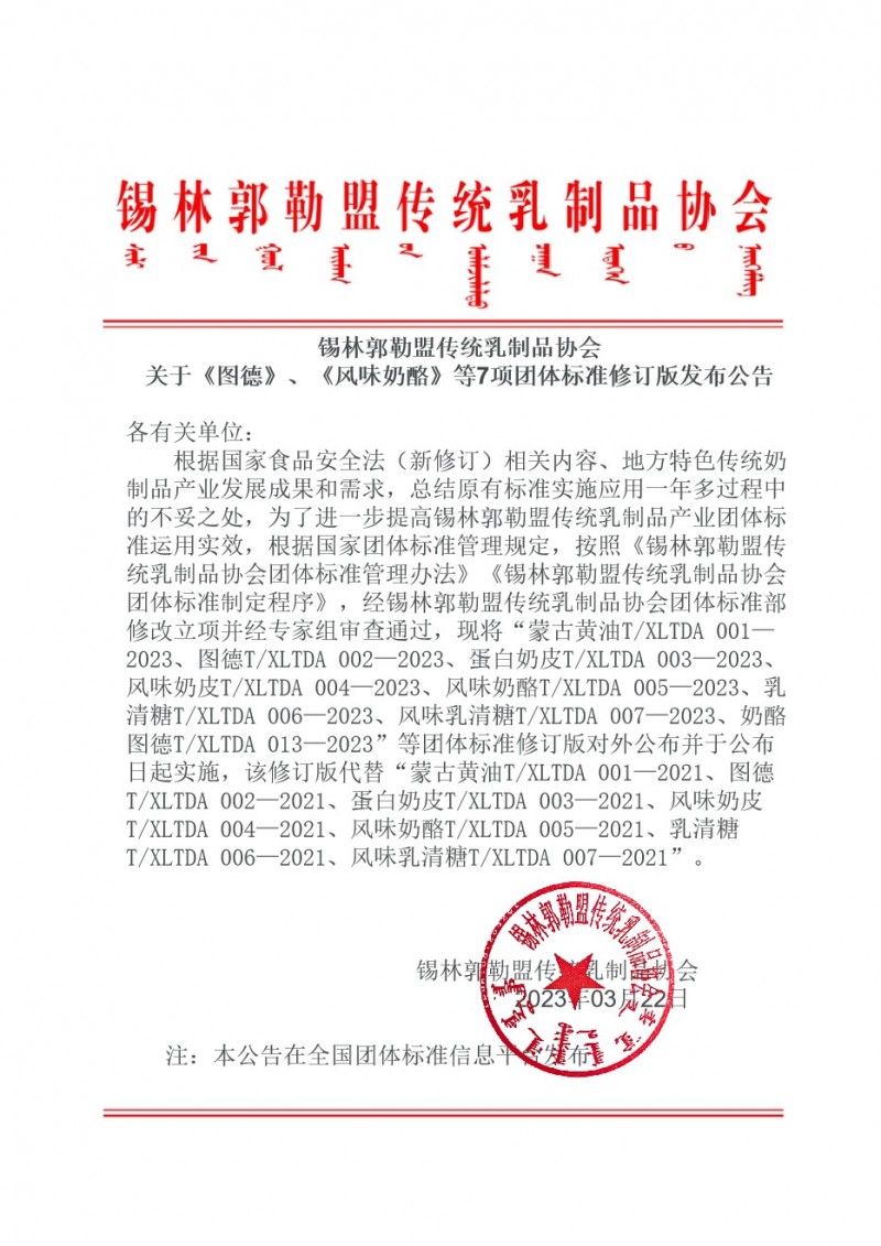 T/XLTDA 001-2023 蒙古黃油 T/XLTDA 002-2023 圖德 T/XLTDA 003-2023 蛋白奶皮 T/XLTDA 004-2023 風(fēng)味奶皮 T/XLTDA 005-2023 風(fēng)味奶酪 T/XLTDA 006-2023 乳清糖 T/XLTDA 007-2023 風(fēng)味乳清糖 T/XLTDA 013-2023 奶酪圖德