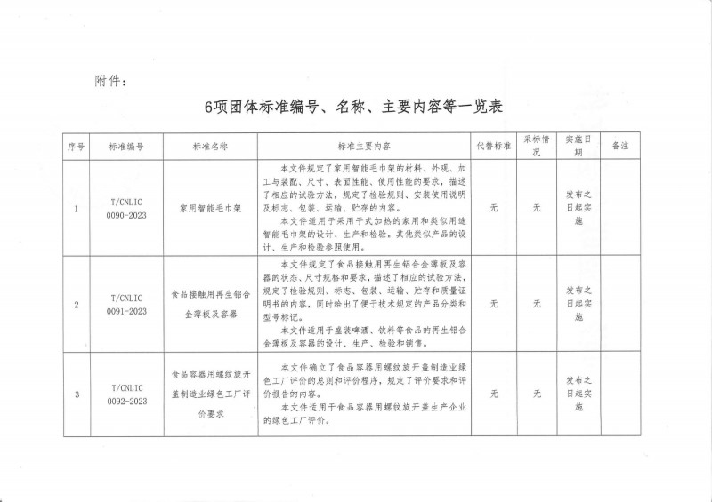 T/CNLIC 0091-2023 食品接觸用再生鋁合金薄板及容器 T/CNLIC 0092-2023 食品容器用螺紋旋開蓋制造業綠色工廠評價要求 T/CNLIC 0093-2023 鍍錫或鍍鉻薄鋼板全開式易開蓋制造業綠色工廠評價要求 T/CNLIC 0094-2023 涂覆鍍錫或鍍鉻薄鋼板制造業綠色工廠評價要求 T/CNLIC 0100-2023 使用或不使用化學阻垢劑的飲用水處理裝置效能評價規范