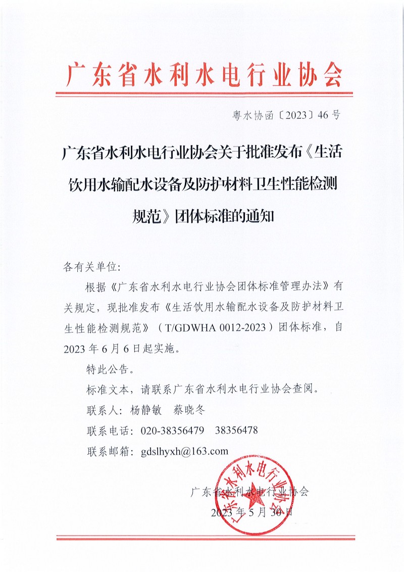 以上為廣東省水利水電行業協會關于批準發布《生活飲用水輸配水設備及防護材料衛生性能檢測規范》團體標準的通知(粵水協函〔2023〕46號)的檢測服務介紹,如有其他疑問可聯系在線工程師!