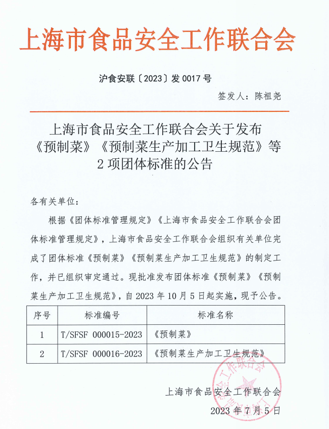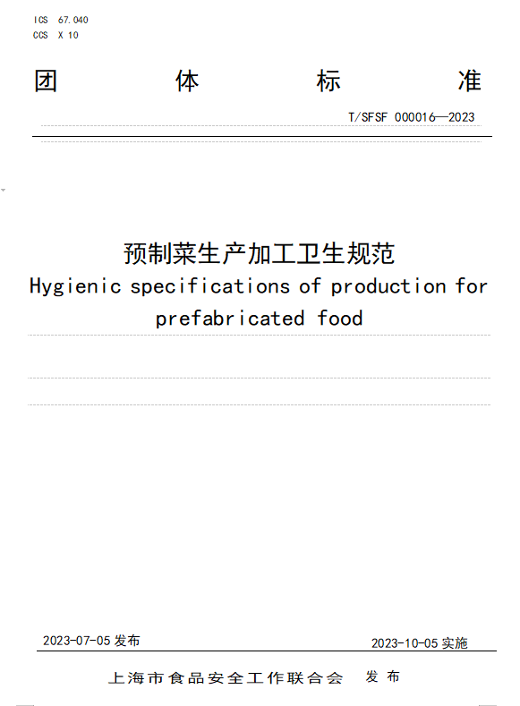 根據國家標準化管理委員會、民政部制定的《團體標準管理規定》和《上海市食品安全工作聯合會團體標準管理規定》,上海市食品安全工作聯合會組織有關單位完成了團體標準《預制菜》《預制菜生產加工衛生規范》的制定工作,并已組織審定通過?,F批準發布團體標準《預制菜》《預制菜生產加工衛生規范》,自2023年10月5日起實施。