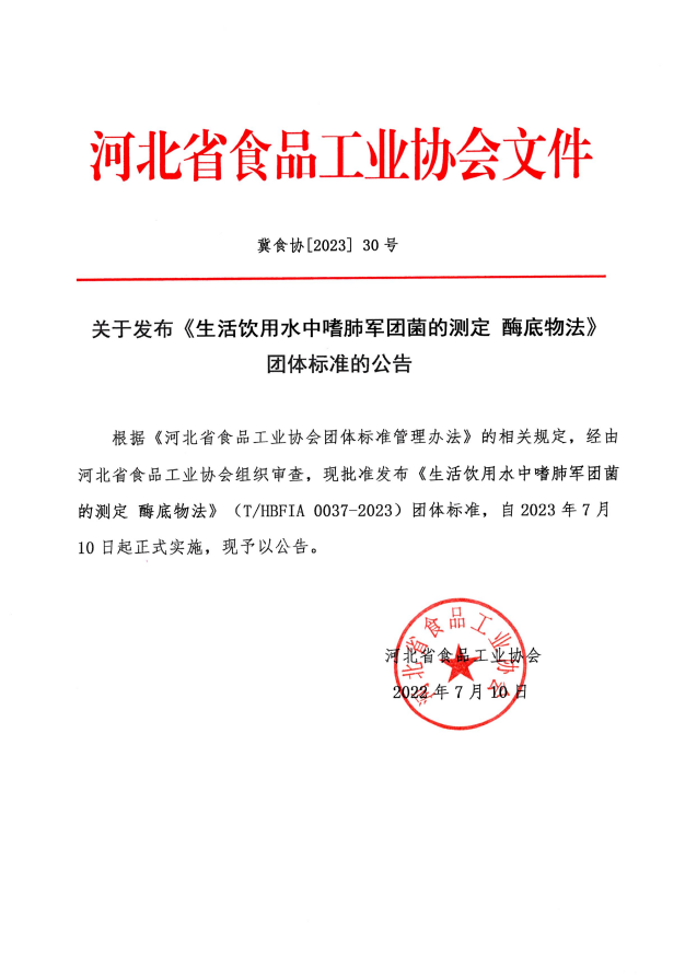 以上為河北省食品工業協會關于發布《生活飲用水中嗜肺軍團菌的測定 酶底物法》 團體標準的公告(冀食協[2023]30號)的檢測服務介紹,如有其他疑問可聯系在線工程師!