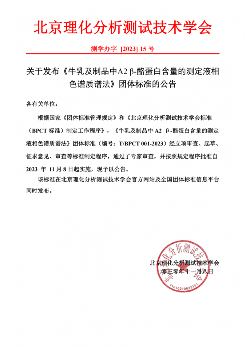 以上為北京理化分析測試技術學會關于發布《牛乳及制品中A2 β-酪蛋白含量的測定液相色譜質譜法》團體標準的公告(測學辦字[2023]15號)的檢測服務介紹,如有其他疑問可聯系在線工程師!