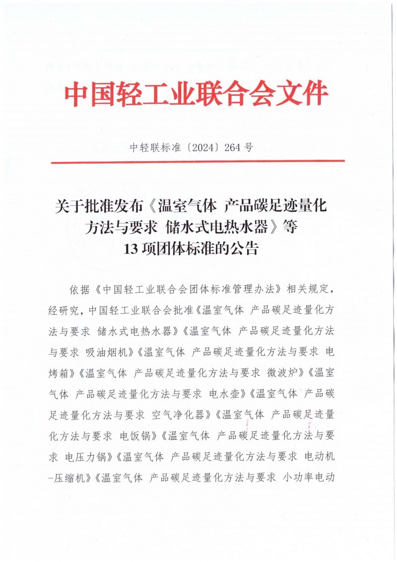 以上為中國輕工業聯合會關于批準發布《溫室氣體 產品碳足跡量化方法與要求 儲水式電熱水器》等13項團體標準的公告(中輕聯標準[2024]264號)的檢測服務介紹,如有其他疑問可聯系在線工程師!